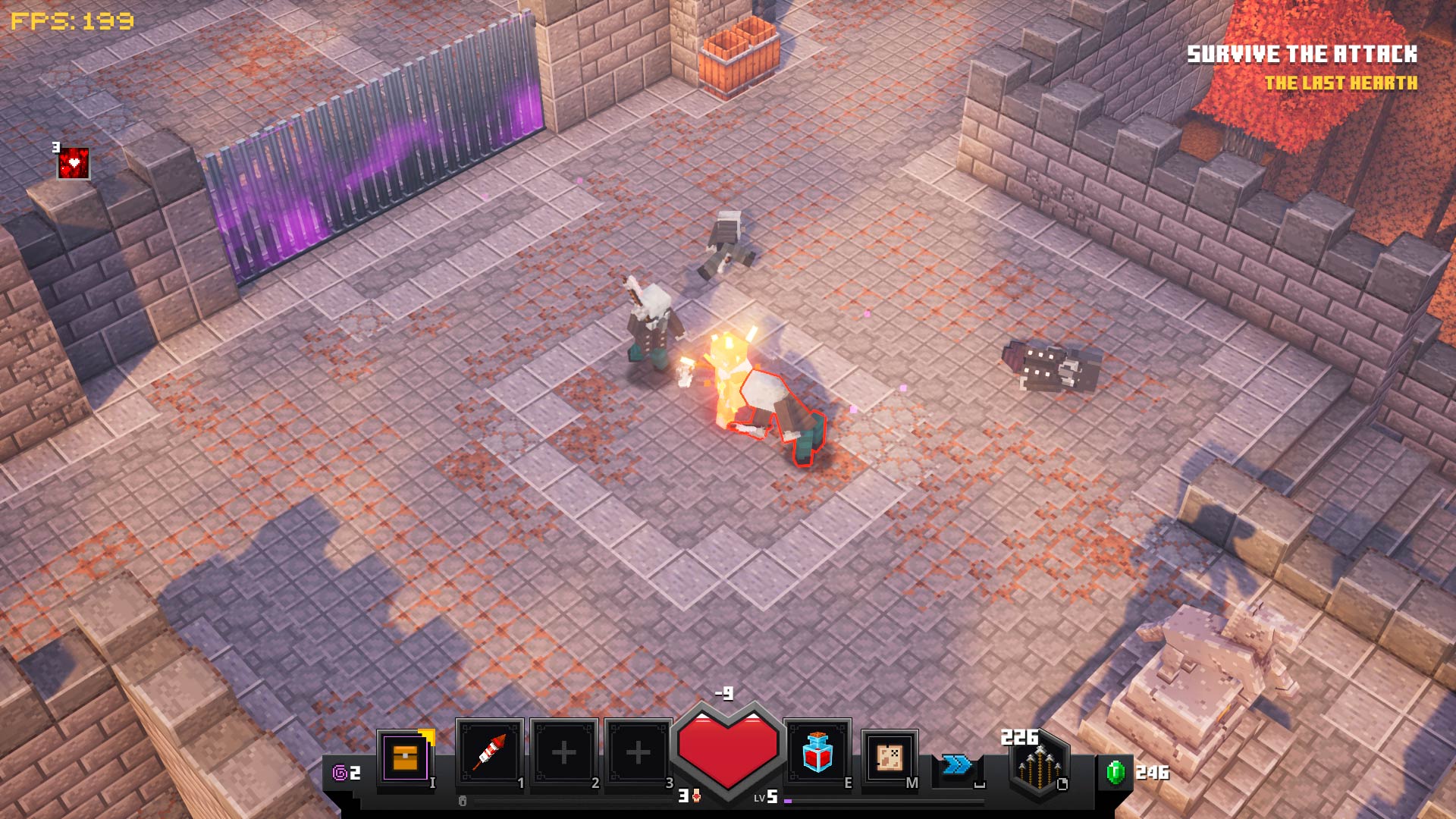 Otra de las virtudes de la producción de Mojang Studios son las batallas contra los jefes de nivel. En determinadas misiones tendremos que medirnos con grandes enemigos que ocupan la mitad de la pantalla, los cuales generan monstruos y a su vez nos arrojan magias o proyectiles. Si bien no son batallas especialmente complicadas, al menos en el nivel de dificultad base, confiarnos puede pasarnos factura ya que estas criaturas causan una cantidad de daño considerable. En este punto hay que tener en cuenta dos factores que pueden cambiar el curso de la batalla. En primer lugar, disponemos de una poción de salud. Este ítem nos repone toda la salud, aunque tiene un tiempo de reutilización bastante largo, por lo que siempre eché mano a dicho recurso cuando el riesgo de morir era elevado. En segundo lugar, el arma a distancia. Ésta nos permite atacar de lejos, pero—sí, hay un pero—si por casualidad nos quedamos sin munición, estaremos obligados a acercarnos para golpear y ahí les deseo buena suerte: la mayoría de los jefes pueden aplastarnos en cuestión de segundos. También disponemos de una voltereta al mejor estilo Dark Souls, la cual permite evitar ataques, aunque tiene un cooldown que limita su uso.
