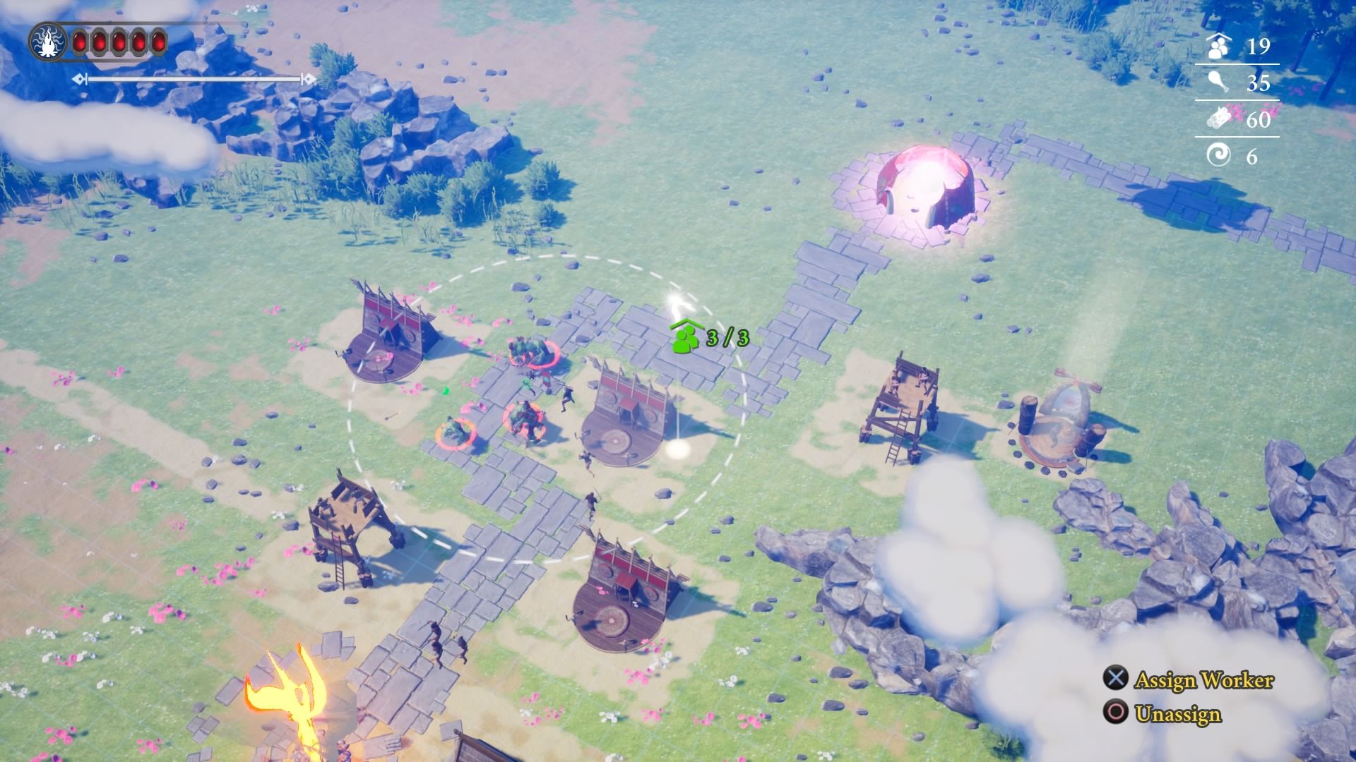 Lo primero lo realizaremos en una suerte de híbrido de Tower Defense y RTS clásico. Usando a Helios como un ave, contaremos con ciertos recursos básicos, como madera, comida e individuos, para ir construyendo defensas como torres de arqueros, edificios para ataques mágicos o simples puestos de guerreros. Digo “suerte de híbrido”, porque si bien nuestra acción defensiva consiste en poner estructuras alrededor de caminos ya delimitados por los cuales vendrán las criaturas enemigas, para obtener los recursos antes mencionados hace falta recolectarlos. Dicha acción se realiza creando puestos cerca de árboles para obtener madera, o construyendo criaderos de ganado/cosechas para el alimento que necesitaremos si queremos seguir desplegando más unidades humanas. Entre cada ataque de hordas, nuestros aldeanos conversarán mediante cuadros de diálogos, generando a veces situaciones de lo más simpáticas y chistes efectivos que sacarán alguna sonrisa.