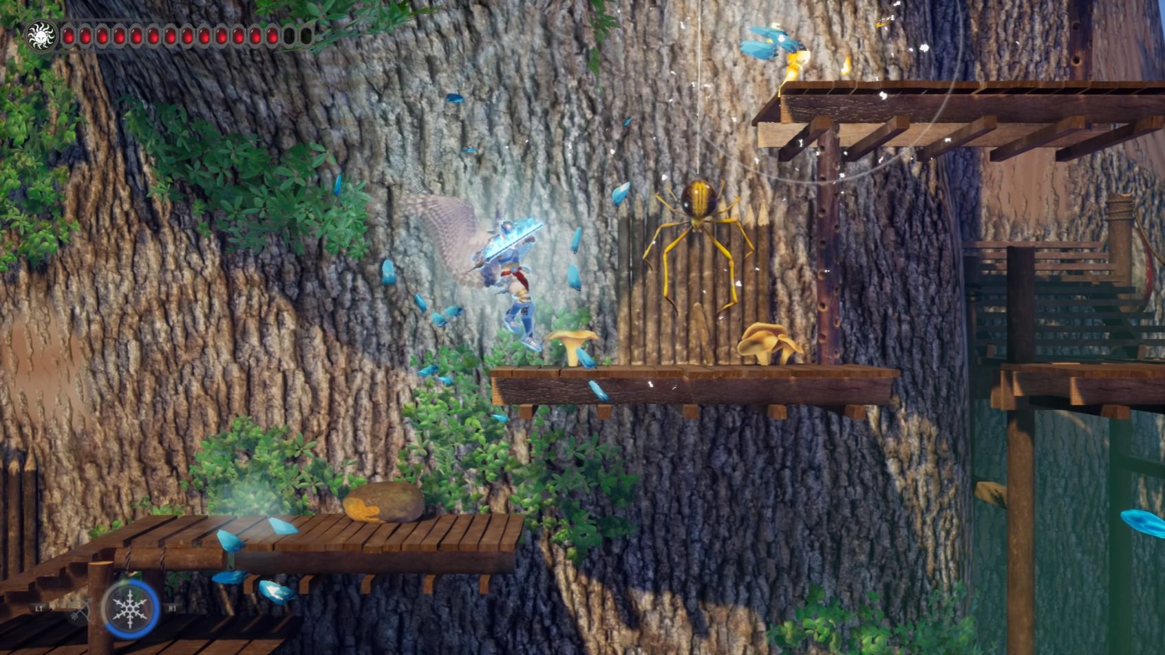 La cuestión de la “limpieza de núcleos” se lleva a cabo en escenarios 2D, en los cuales controlaremos a Helios en su manifestación humana. Saldrán enemigos de todos los rincones, quienes caerán ante unos pocos espadazos o contra algunas habilidades especiales, como un arco y flecha, una llamarada de fuego o hacer caer rayos del cielo. Aparte de carne fresca, los niveles cuentan con secciones de plataformas para estar a puro salto y caídas, preguntándonos por qué Helios tiene alas si no las piensa usar.